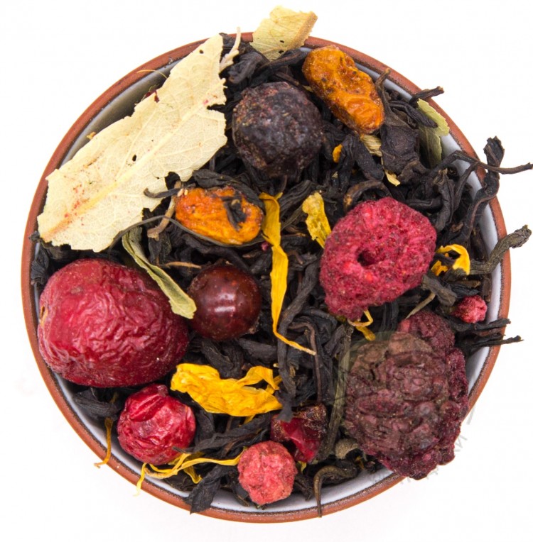 Иван-чай, цветы липы, ягоды облепихи, малины, клубники, ежевики, красной смородины, черной смородины, клюквы, листья ежевики, лепестки календулы